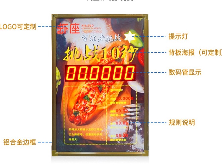 贛鑫抖音10秒計時器-,采用鋁合金邊框,內(nèi)置蜂鳴器,海報可添加LOGo以及自己店鋪游戲規(guī)則。使用壽命長達10W小時。定制咨詢電話18069884716